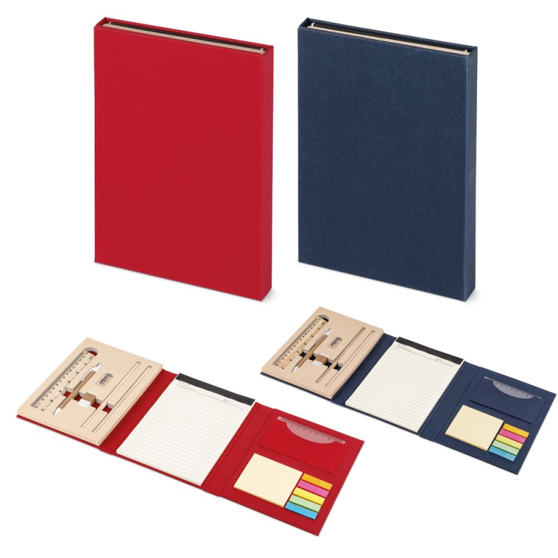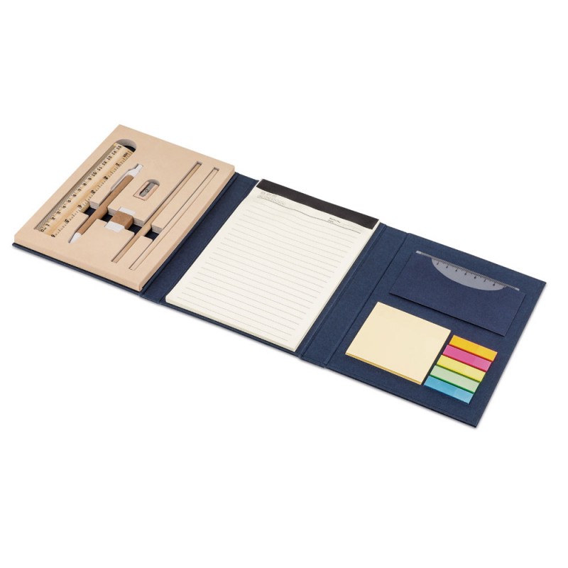Set with A5 notepad with 120 lined pages, sticky notes (25 per colour), plastic ruler, wooden ruler, ball pen, two graphite pencils, wood sharpener and eraser. 152 x 210 x 25 mm