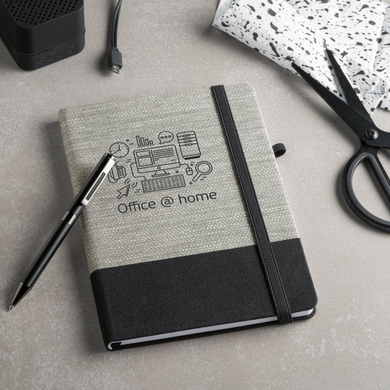 A5 notepad with hardcover and rounded corners made from natural straw fibres and cotton canvas. This notepad has 192 lined white pages, bookmark ribbon, elastic band and pen holder (pen not included). 150 x 210 mm.